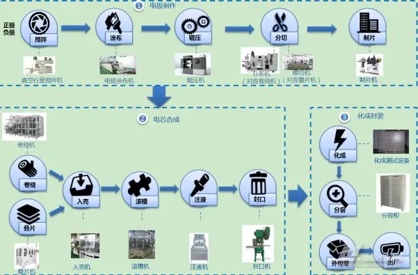 鋰電池的生產(chǎn)工藝流程較長(zhǎng),生產(chǎn)過(guò)程中涉及有50多道工序。其生產(chǎn)工藝有一定差異,但整體上可將鋰電制造流程劃分為前段工序(極片制造)、中段工序(電芯合成)、后段工序(化成封裝)。由于鋰離子電池的安全性能要求很高,因此在電池制造過(guò)程中對(duì)鋰電設(shè)備的精度、穩(wěn)定性和自動(dòng)化水平都有極高的要求。