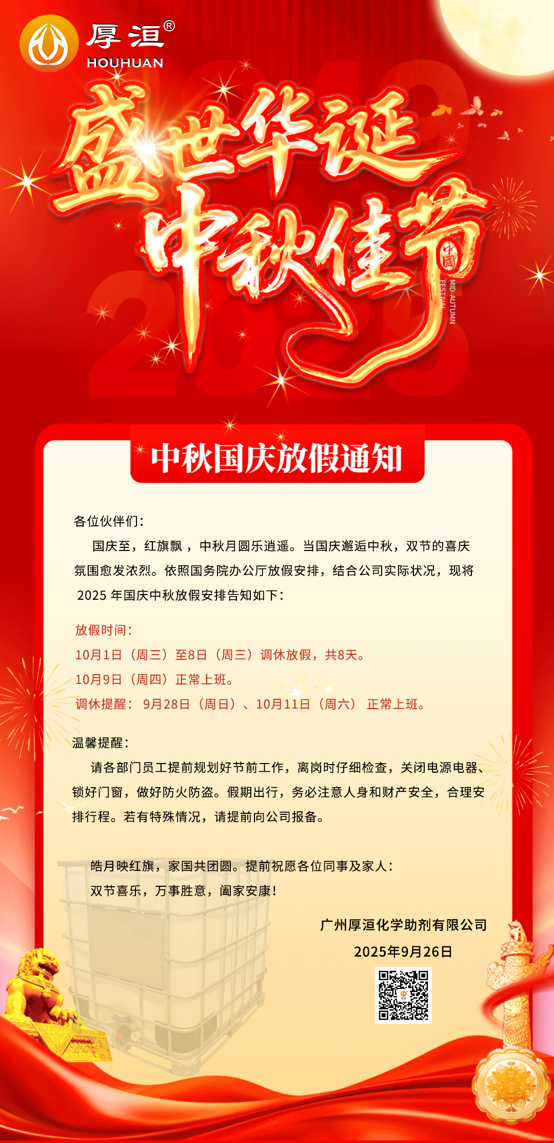 國慶至,紅旗飄 ,中秋月圓樂逍遙。當國慶邂逅中秋,雙節(jié)的喜慶氛圍愈發(fā)濃烈。依照國務院辦公廳放假安排,結(jié)合公司實際狀況,現(xiàn)將 2025 年國慶中秋放假安排告知如下: